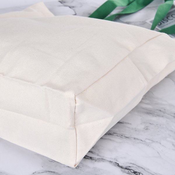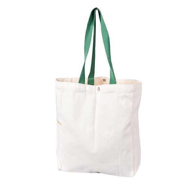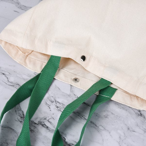 2. 10安米色帆布袋-有底有側,綠色織帶提繩設計,時尚實用。