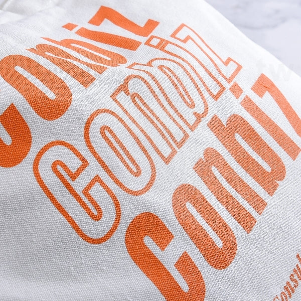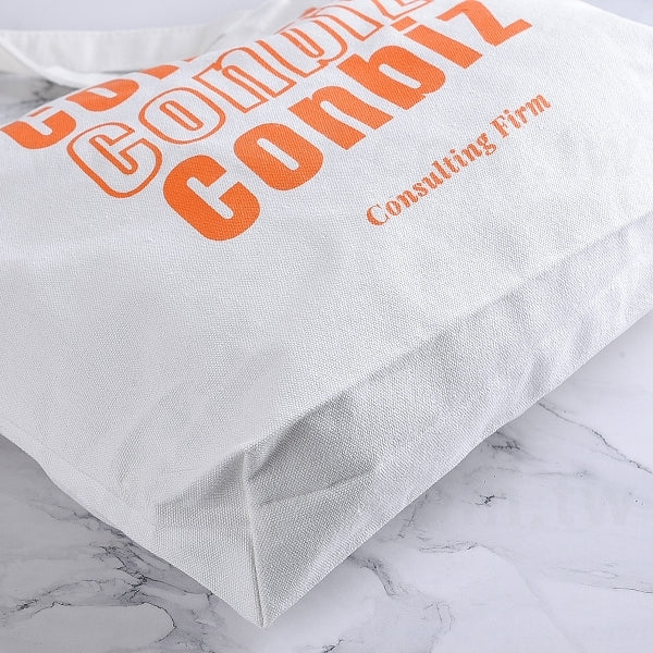 1. 客製化12安白色帆布袋,尺寸為W43XH32.5XD9公分,提繩為2.5X60公分(外露)/2.5X68公分(含車縫),印刷色為Pantone 1585C。
