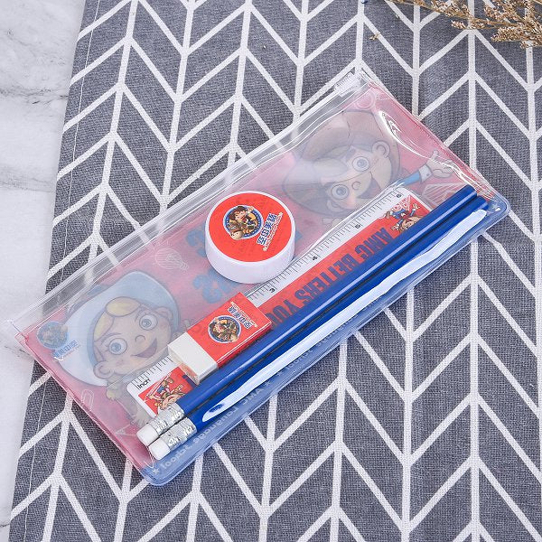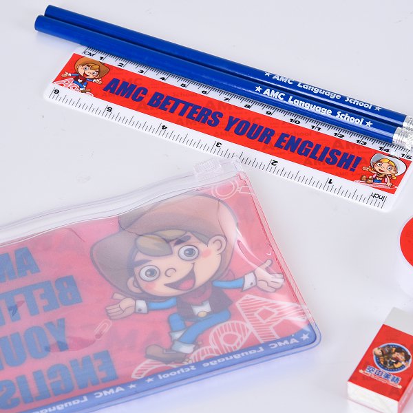 1. 文具組禮贈品包含鉛筆、尺、削筆機、橡皮擦和夾鍊袋,尺寸各異,適合各種使用場景。