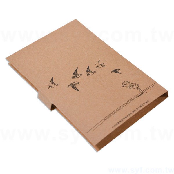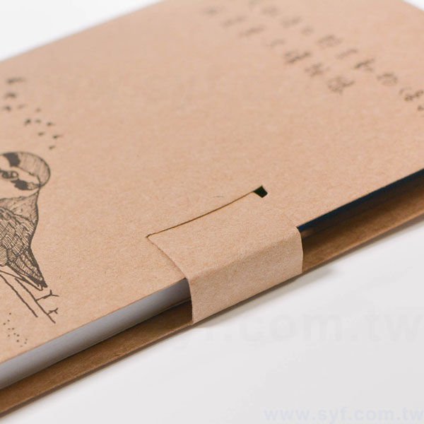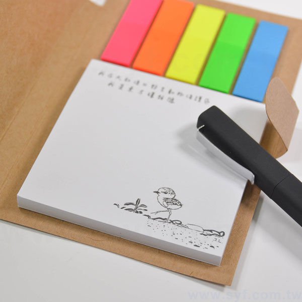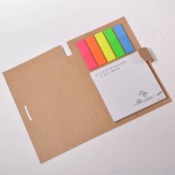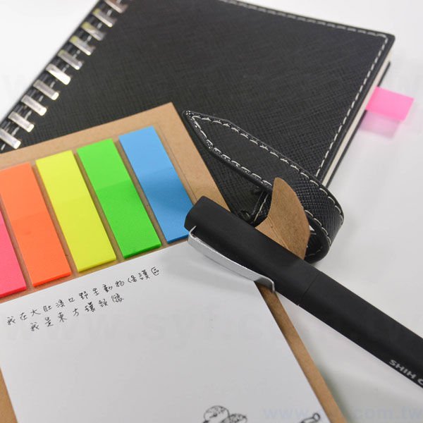 2. 牛皮紙質感封面可客製化印刷,廣告效果提升,內附五色標及兩款不同尺寸的便利貼。