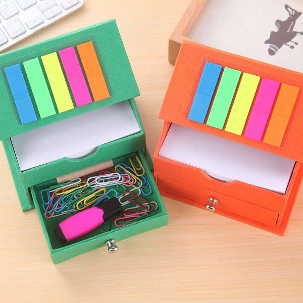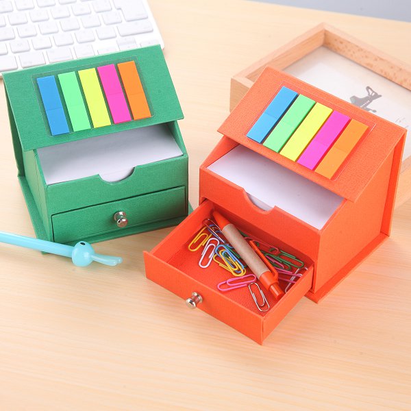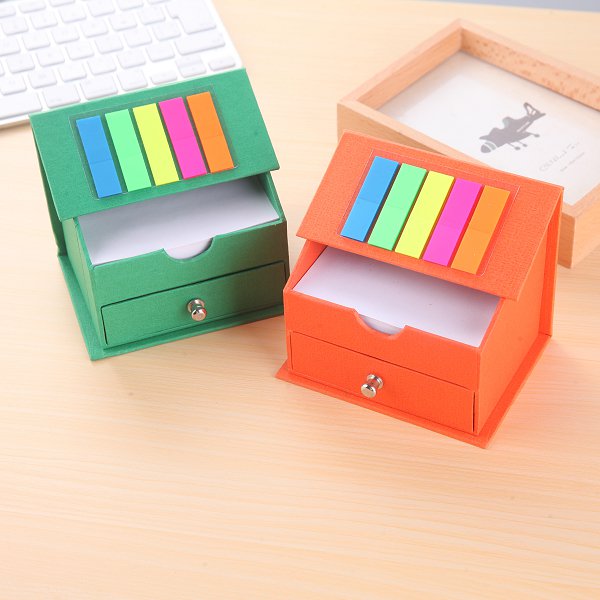 1. 辦公室必備!收納抽屜房屋造型4合1便利貼套組,提高工作效率。外殼材質為牛皮紙,尺寸為11.5*10*8.8cm,便條紙200張,五色標25張。便條紙尺寸為9.8*7.4cm,五色標尺寸為4.5*1.2cm。圓珠筆、迴紋針一應俱全,方便隨時做筆記、整理文件。