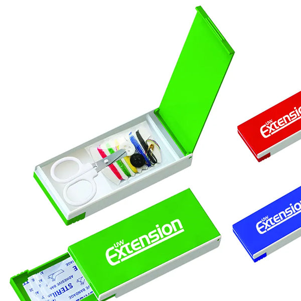 1. 便攜式旅行迷你針線包帶藥盒,尺寸為10.5x4.6x0.7cm,方便攜帶修補衣物。
