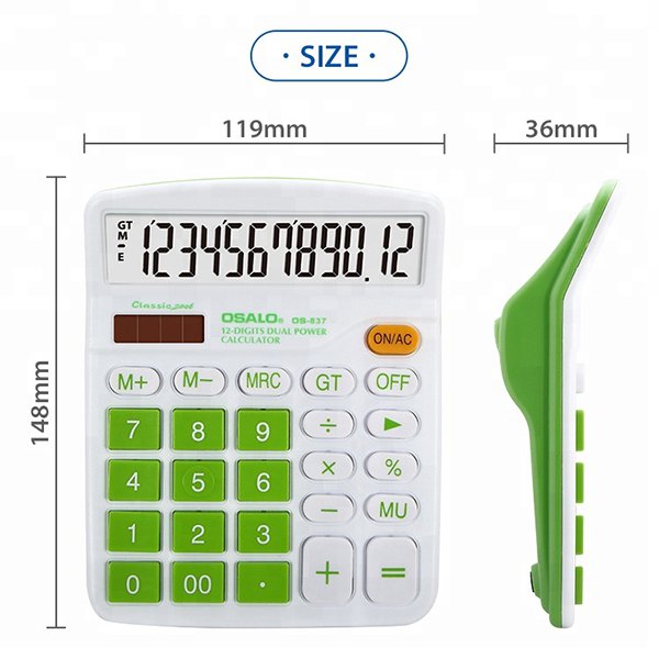 1. 基本款12位數太陽能計算機,塑膠材質,尺寸14.8*11.9*3.6cm,重量118g,輕巧便攜,適合商務人士使用,