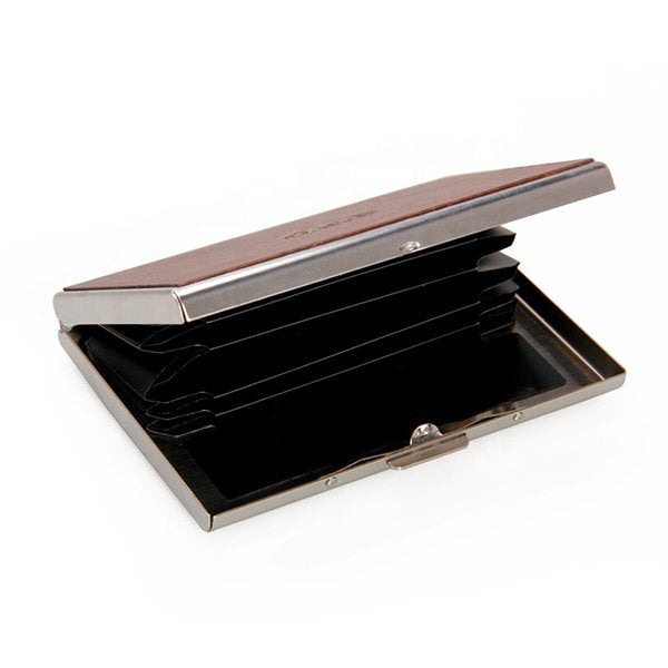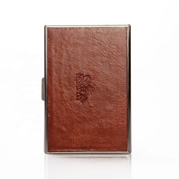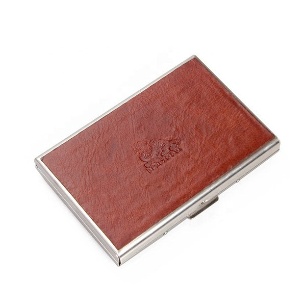 1. 棕色PU皮革金屬商務名片夾,尺寸為9.5*7*1.6CM,材質為PU皮革和不銹鋼,展現高品質和專業形象。