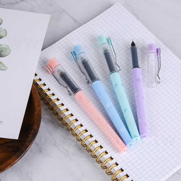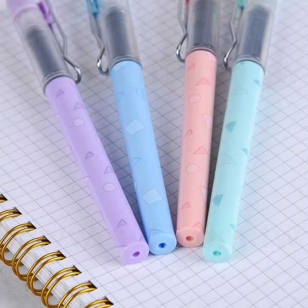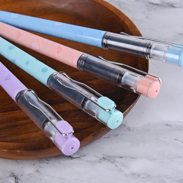 1. 幾何粉彩直液式中性筆,14cm尺寸,拔蓋式設計,俐落大方,同色系幾何粉採管,透明筆蓋彩色點綴。