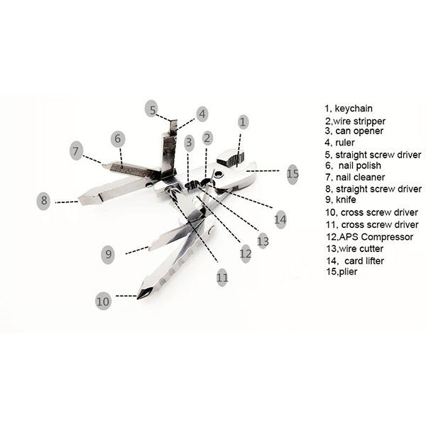 1. 多功能摺疊工具鉗擁有15合1設計,適合各種場合使用,功能多樣化,方便實用。