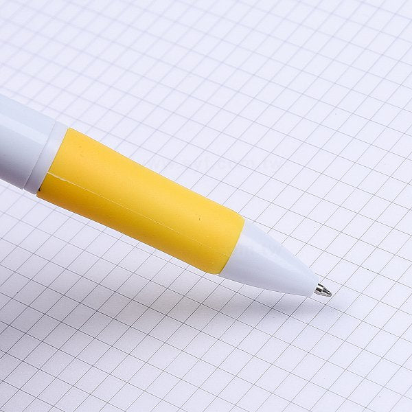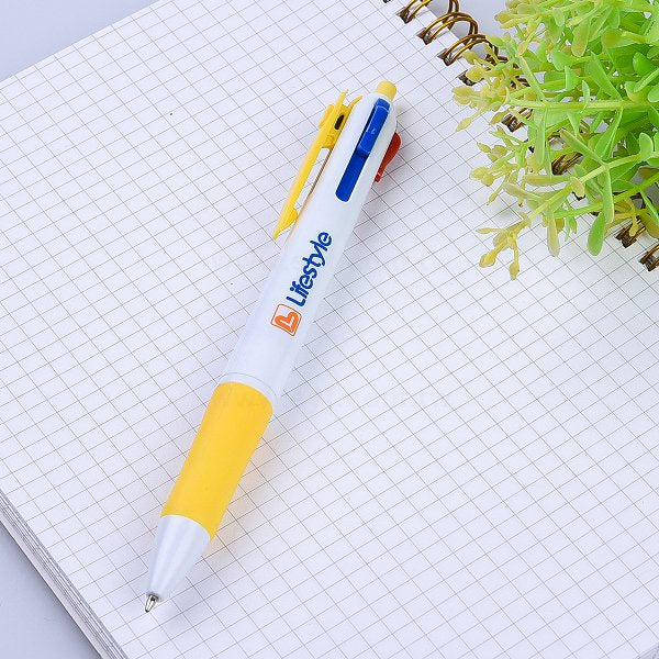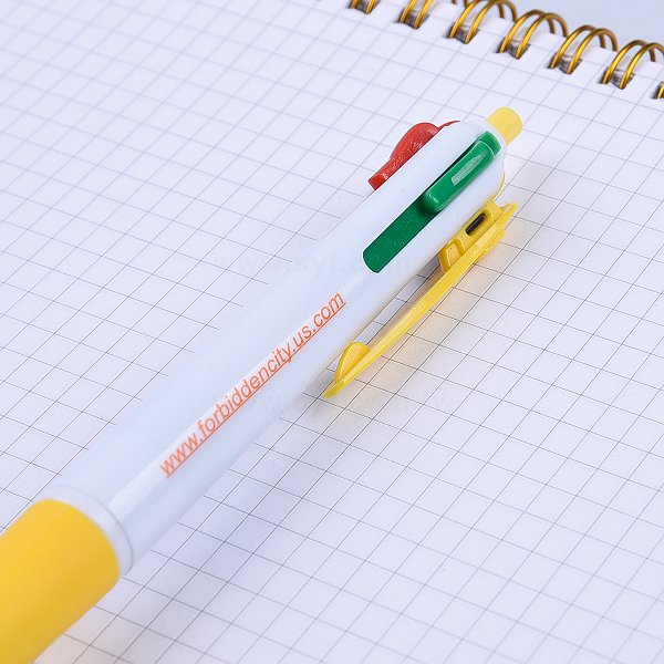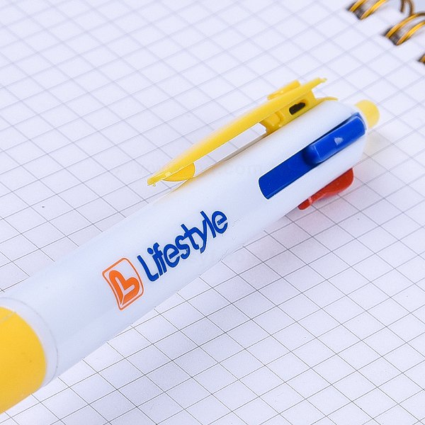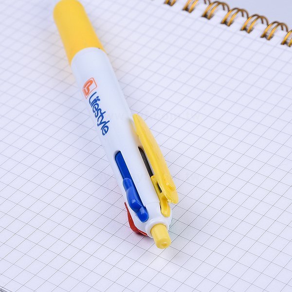 1. 廣告筆為四色原子筆,筆桿白色搭配黃色配件,尺寸14.5cm,適合辦公室文件標記及商務禮贈使用。