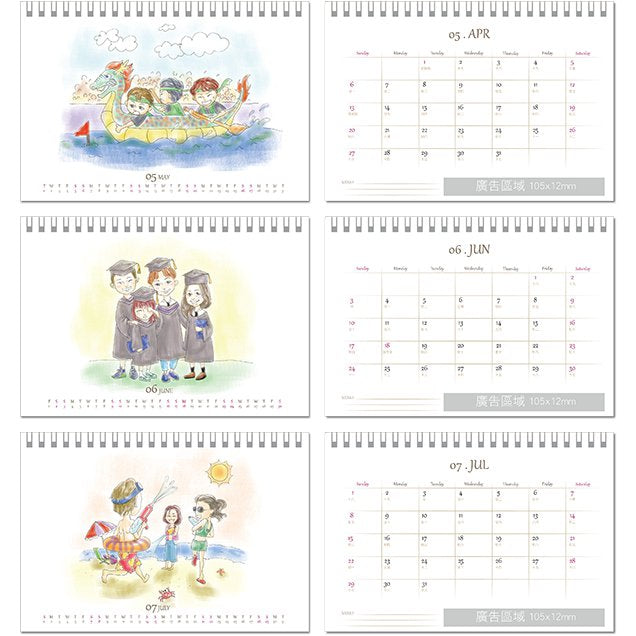 2. 桌曆尺寸為20x14.5cm,印刷方式為雙面彩色,每本13張桌曆紙張。