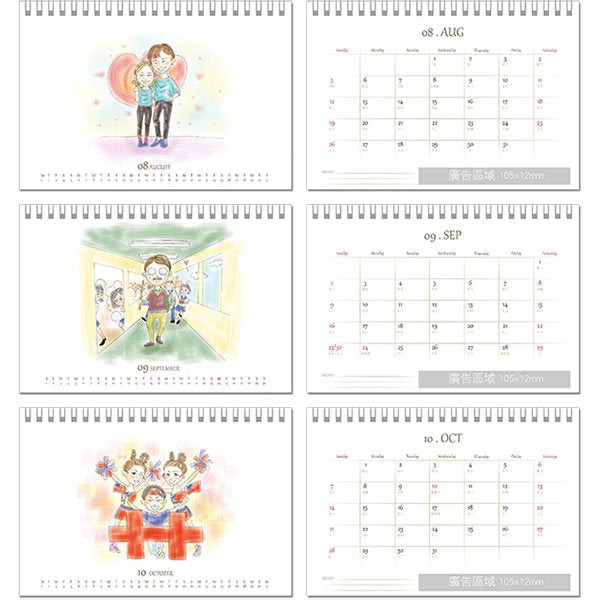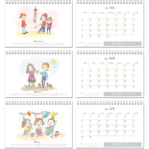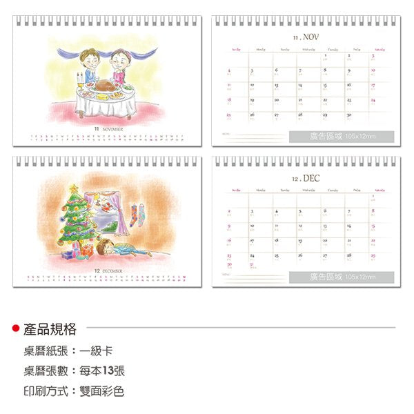 2. 桌曆尺寸為18.8x13cm,採用一級卡紙張,每本13張。