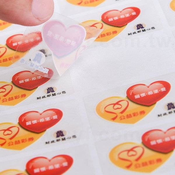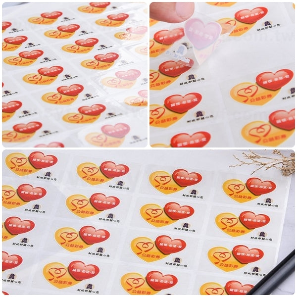 1. 透明貼紙具防水特性,適用於汽車、設備維修保養及包裝材料。貼於透明瓶身,具透視效果,不影響原有質感。適用於瓶貼、包裝材料、化妝品類貼紙、玻璃、壓克力等。製作時間快速,數量500張起印,尺寸可選擇10mm至85mm。