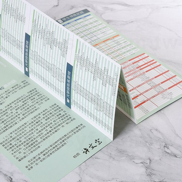 1. 150P雪銅招生簡介-S摺雙面彩印,尺寸為50*29.7cm(4K),展開後為摺紙S折(3折4面),印刷方式為雙面彩色,展現專業形象。
