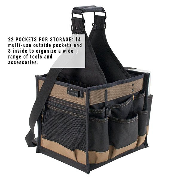 1. 耐用手提工具袋附塑膠收納盒,提供22個工具袋,外部14個口袋和內部8個口袋,方便收納各種工具和配件。