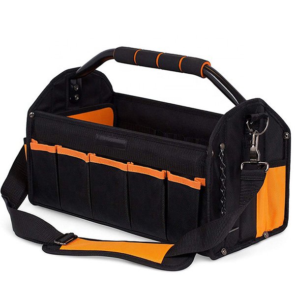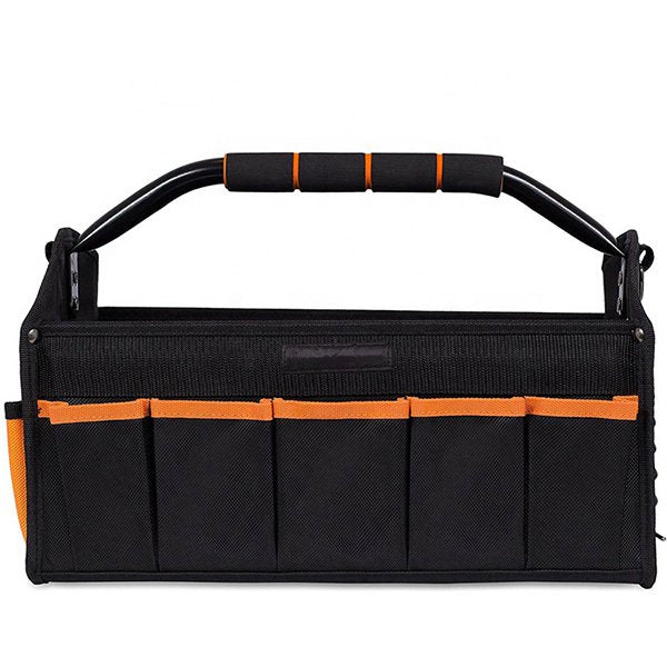 1. 耐重型泡棉握把大工具袋,採用優質滌綸材質製成,尺寸為40*23*28cm,堅固耐用且具有耐用性。具有多口袋設計,方便整理工具和套件。泡棉握把設計,舒適易握,方便攜帶。