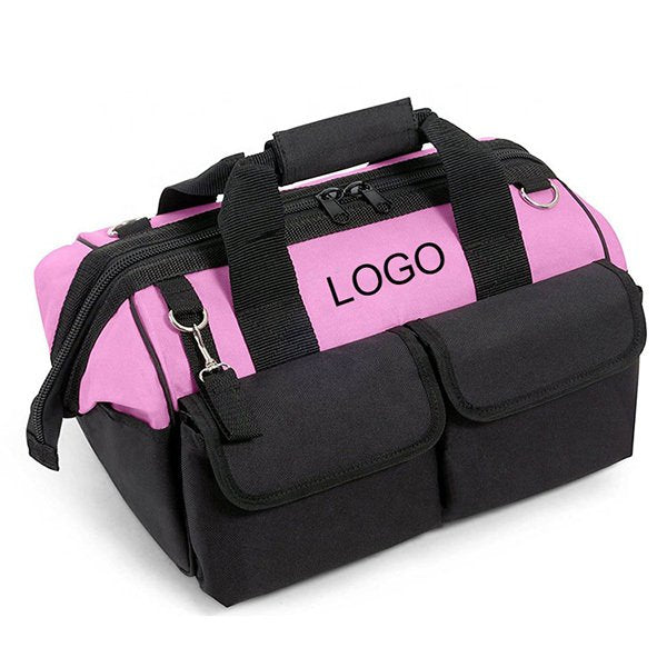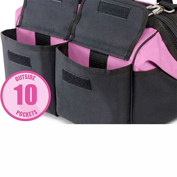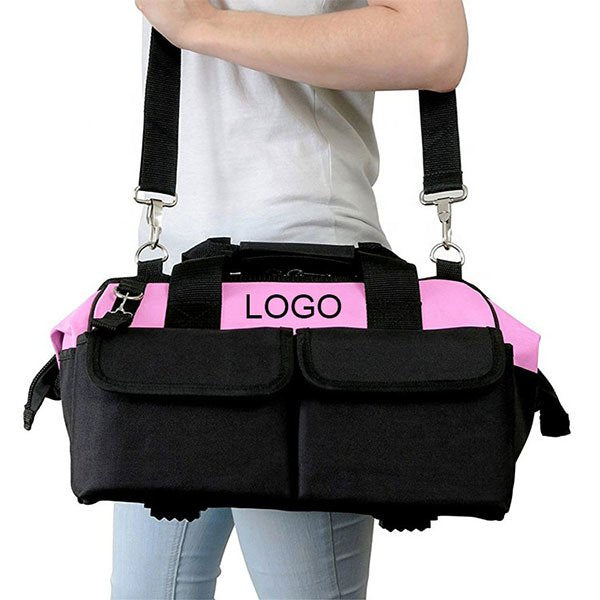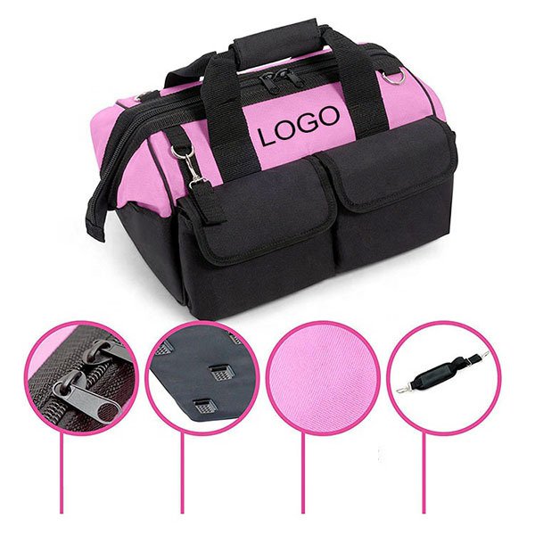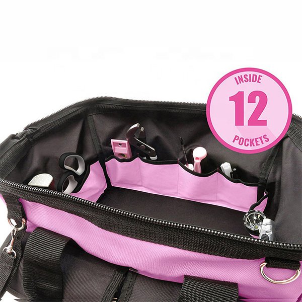 1. 多功能附肩背帶粉色工具袋,外部口袋內部口袋豐富,方便收納各種工具。
