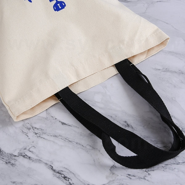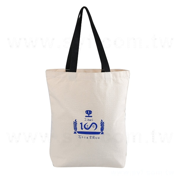 1. 客製化12安米色帆布袋,尺寸為W34XH36XD9公分,提繩為黑色織帶2.5X50公分(外露)/2.5X58公分(含車縫),印刷雙面單色(共版)。