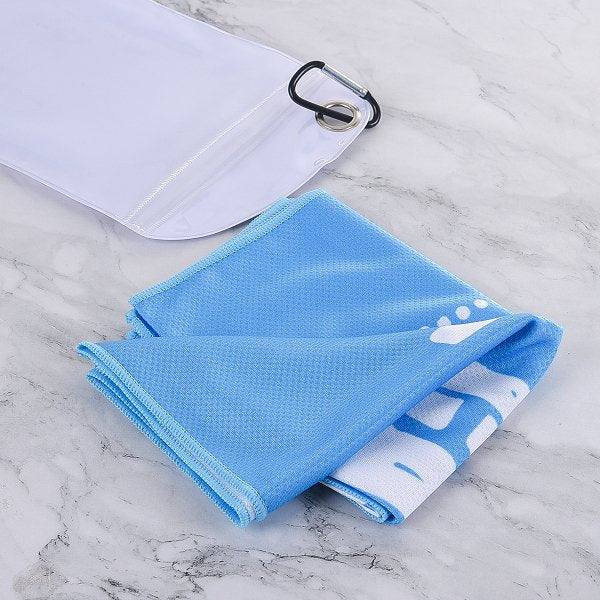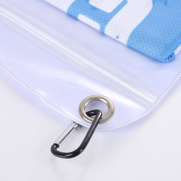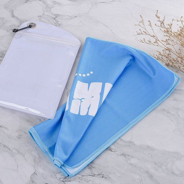 1. 聚酯纖維製成的夾鏈袋裝運動毛巾,尺寸為29*88cm的涼感毛巾和13.9*23cm的袋,適合運動後使用。