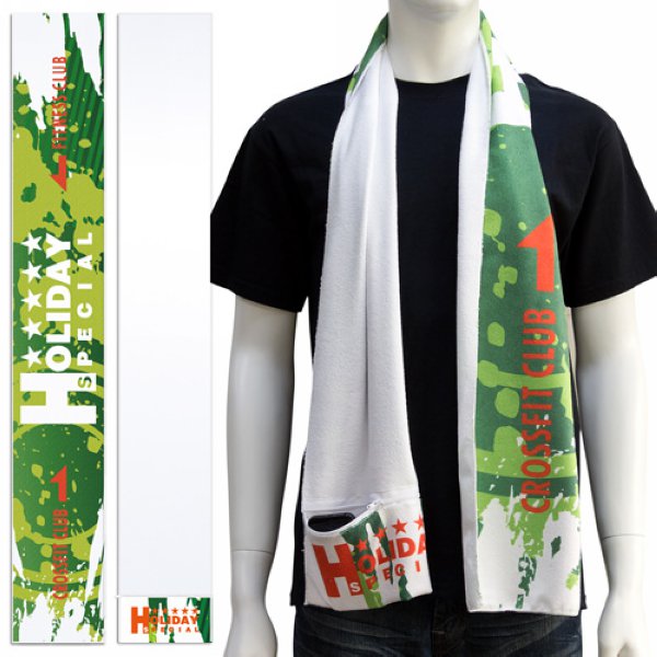 2. 單面熱昇華加長型運動毛巾,拉鍊口袋設計,實用又時尚,客製化彩色印刷,展現專業形象。