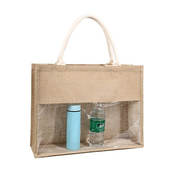 黃麻布拼接透明PVC購物袋
