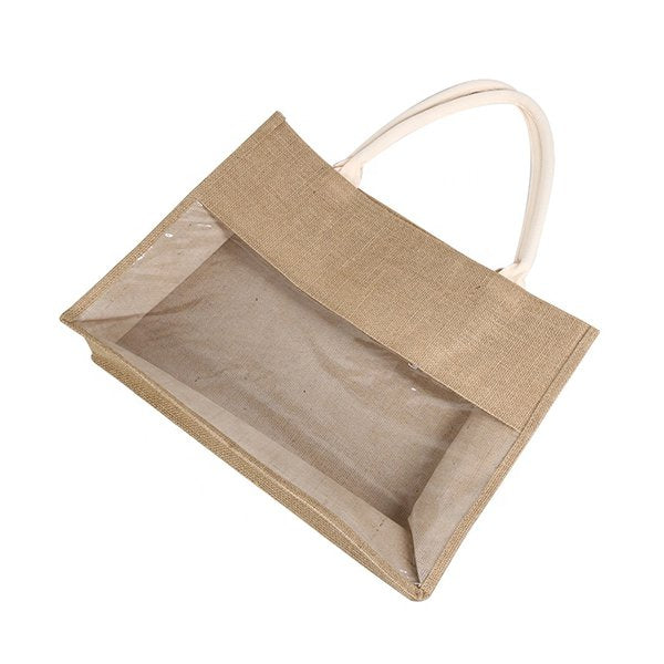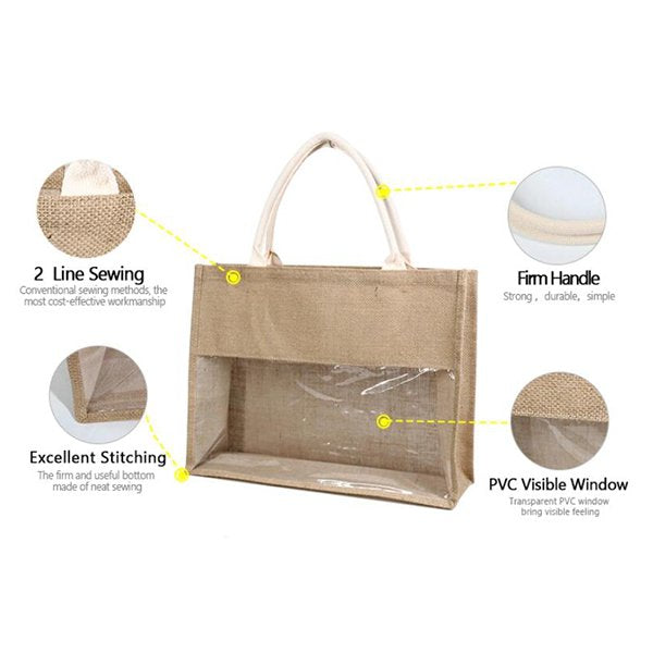 1. 黃麻布拼接透明PVC購物袋,尺寸為W41.5*H33.5*D10cm,材質為原色麻布袋,展現獨特時尚風格。