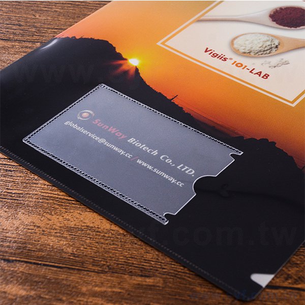 2. L夾正面可加名片袋,印刷成品色彩獨特,適用於企業、公司、補習班等使用。
