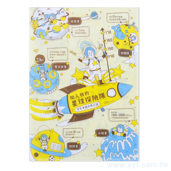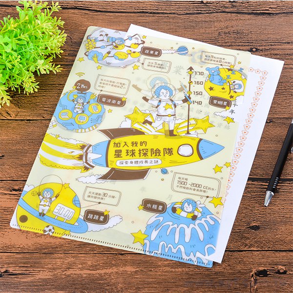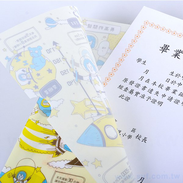 2. 防潑水材質有效保護文件,廣告效果佳,適合學校、企業使用,尺寸為22*31cm,厚度0.18mm,彩色UV印刷。