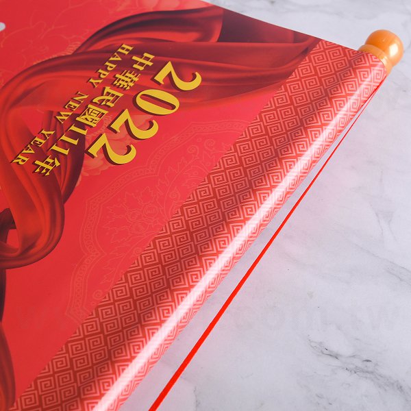 1. 大2K年曆掛軸尺寸為56x89cm,材質為150P特銅紙,廣告範圍為42x6.8cm(限紅色,含框)。