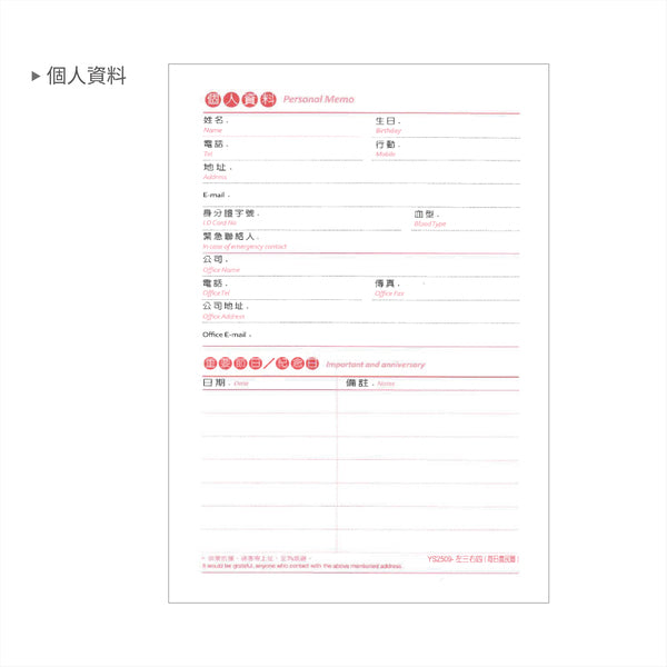 內頁附錄:通訊錄、十大節能減碳宣言、國際航線服務電話、急救電話號碼表、各區醫院電話、計程車服務電話、國際觀光旅館名錄、郵遞區號表、郵局國內函件資費表、高鐵乘車指南、捷運系統路線圖、高速公路線圖、利息換算表、黃金重量換算表、貨櫃材積表、國際標準尺碼表、攝氏華氏溫度對照表、度量衡換算表、個人資料表