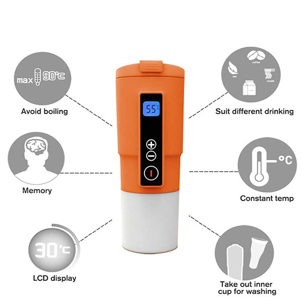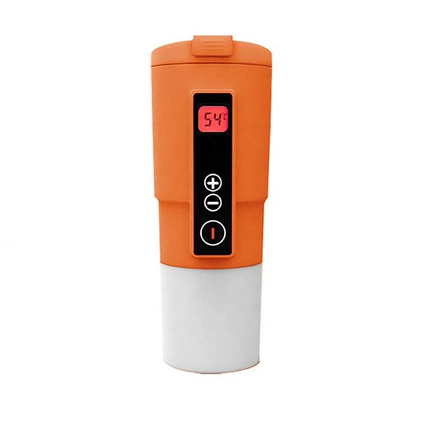 1. 380ml車用智能加熱304不銹鋼隨行杯,外層材質為PP,內層材質為304不銹鋼,容量適中,尺寸為23*9*9cm,重量為450g。