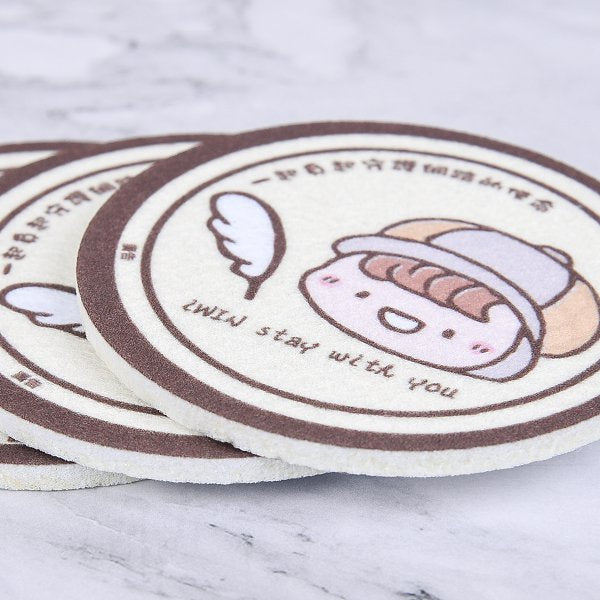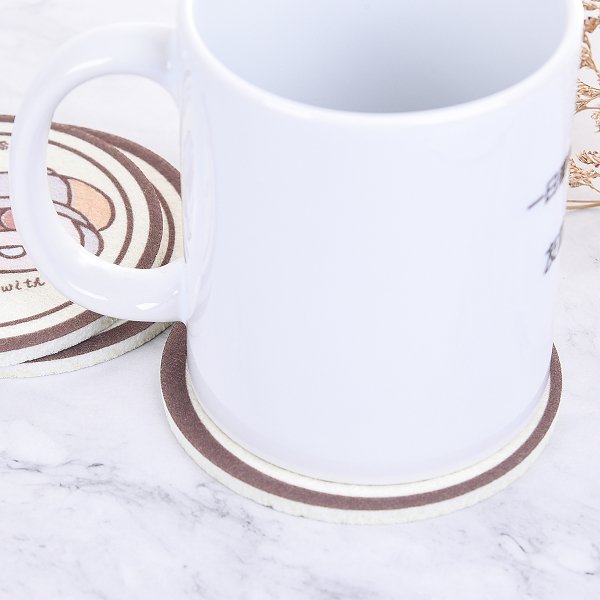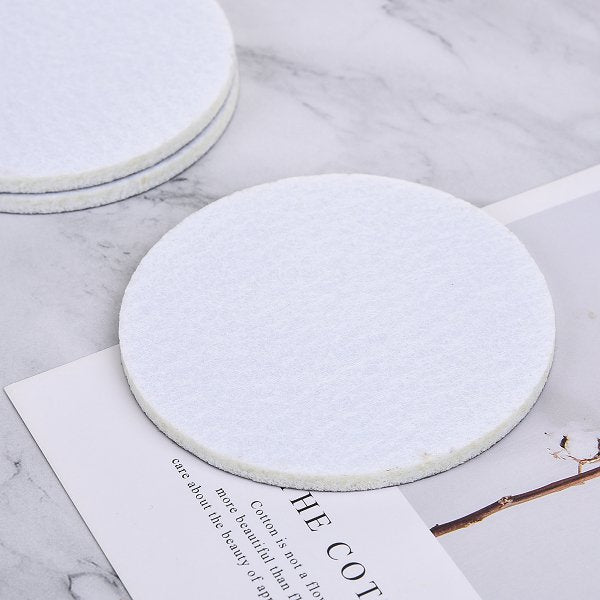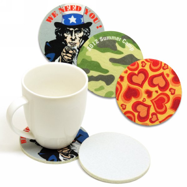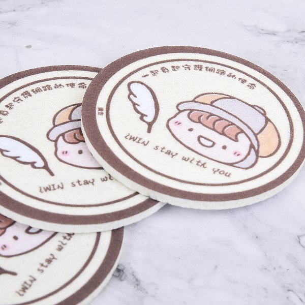1. 5mm厚白色毛氈布製成的圓形杯墊,可滿版昇華熱轉印印刷全彩設計的圖案,環保產品。