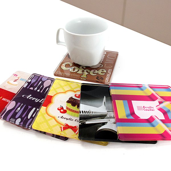 1. 透明方形壓克力杯墊,3mm厚,單面彩色印刷,尺寸9.5 x 9.5cm,適合辦公室使用。