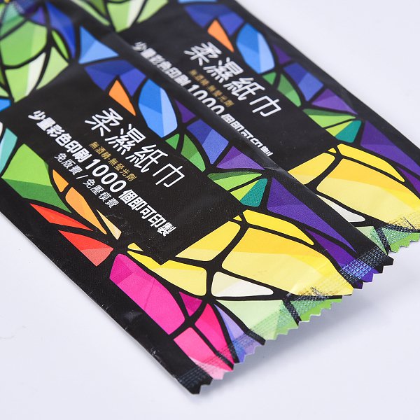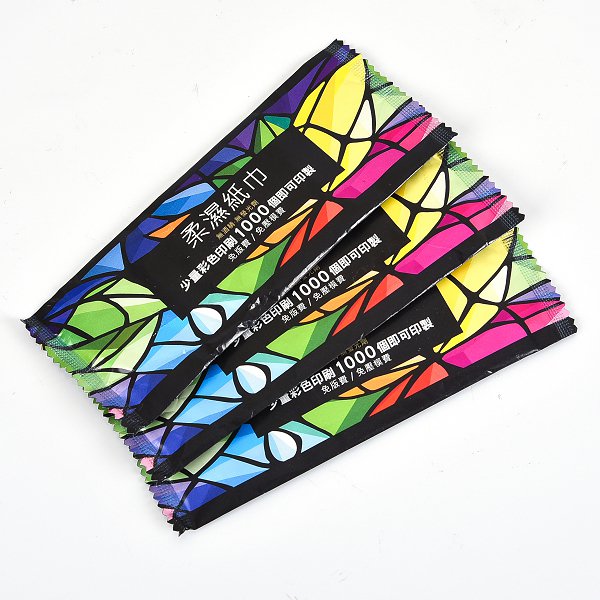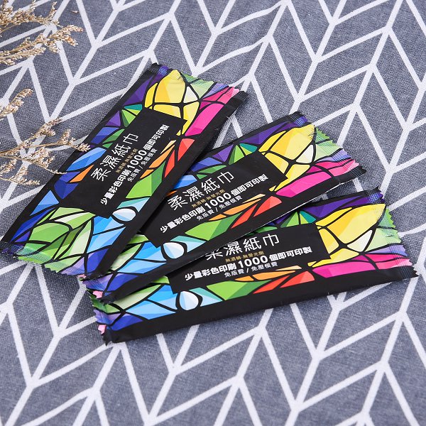 1. 濕紙巾單片裝,尺寸15x6cm,珍珠膜包裝,適合餐飲相關企業使用。