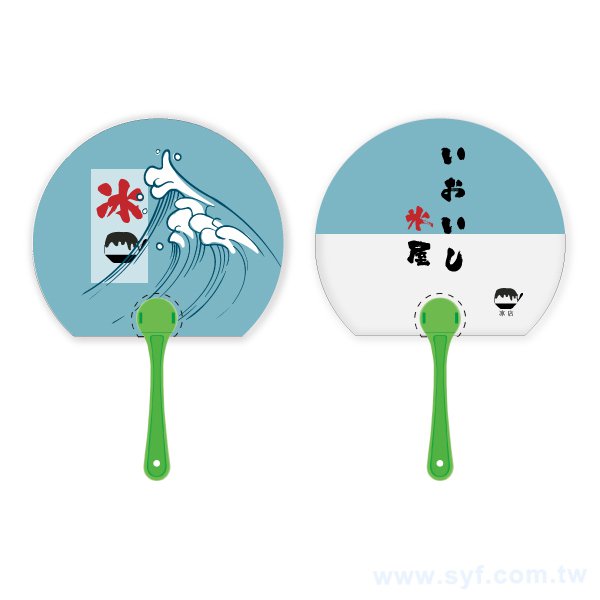 - 扇柄顏色多樣,紅、黃、藍、綠,客製化企業LOGO。