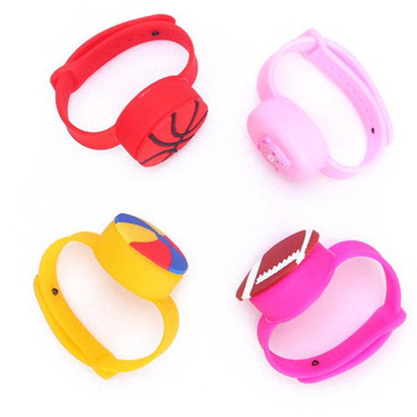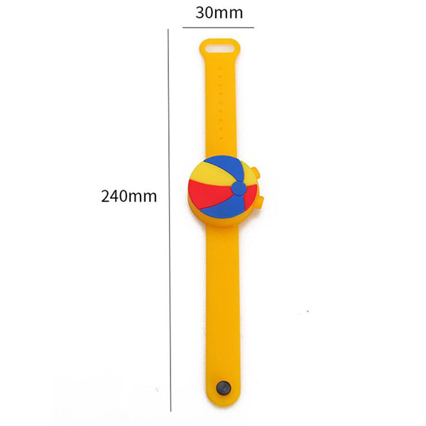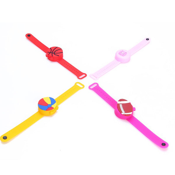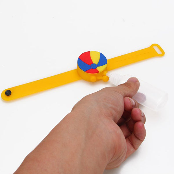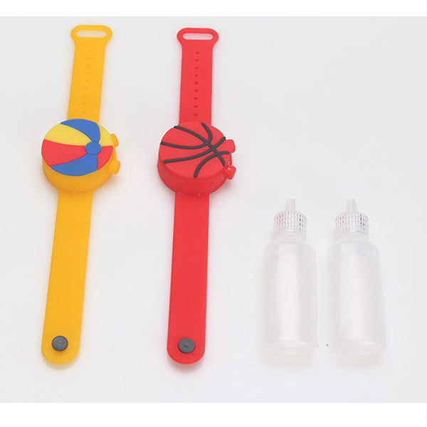 2. 兒童矽膠手環設計,可愛球類造型,深受小朋友喜愛,附贈一個注射瓶,方便裝填消毒液,保持清潔。、