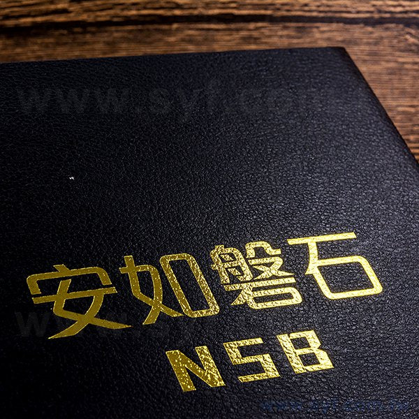 4. 尺寸: 25K,封面材質為亮面粗皮紋裱厚紙板,印刷方式為LOGO燙金,釘裝方式為方背精裝筆記本。