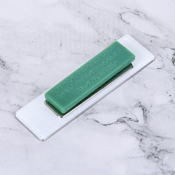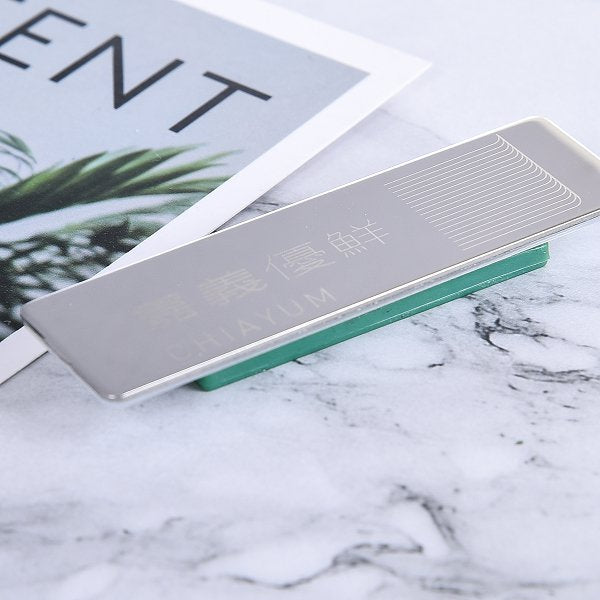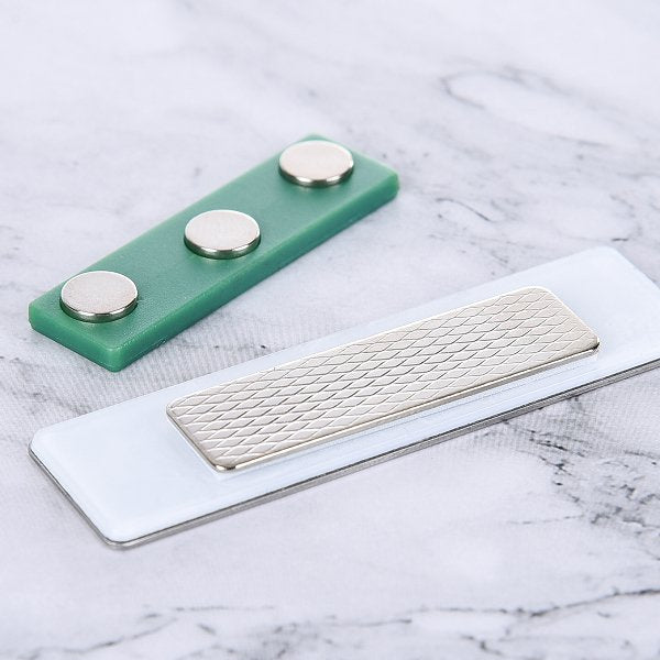 1. 不鏽鋼別針胸牌,展現專業形象,適合公司員工穿戴。尺寸為70*20mm,配有4CM綠色強力磁鐵,穩固不易脫落。
