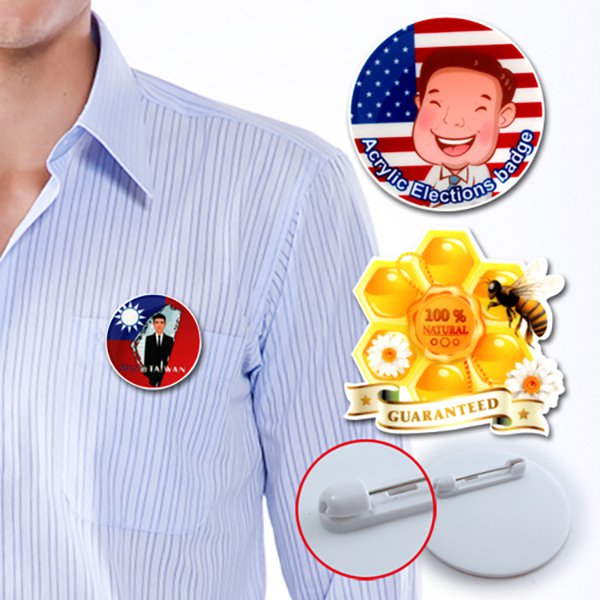 1. 專業製作的壓克力造型胸章,3mm厚度,白色顏色,雷射雕刻造型,彩色印刷,展現精緻圖像及商標。