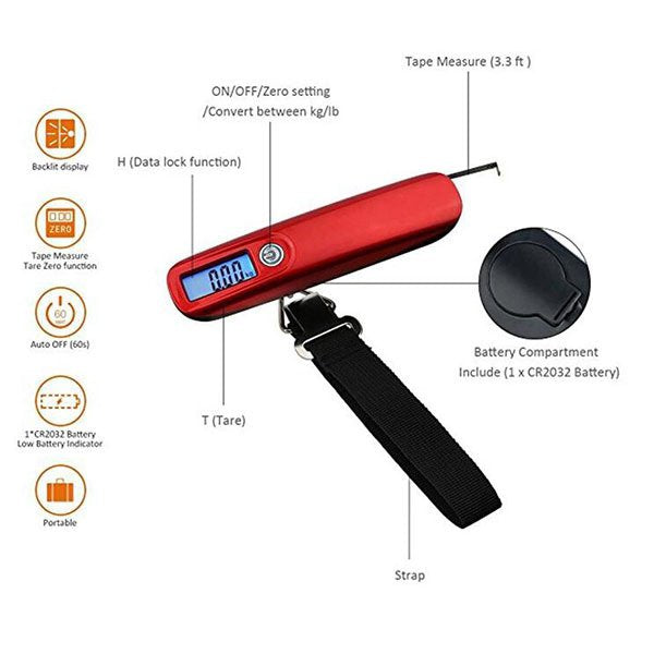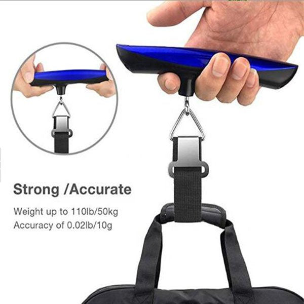 1. 手持式綁帶行李秤具備50kg/10g稱重能力,並附帶捲尺功能,方便測量行李尺寸。