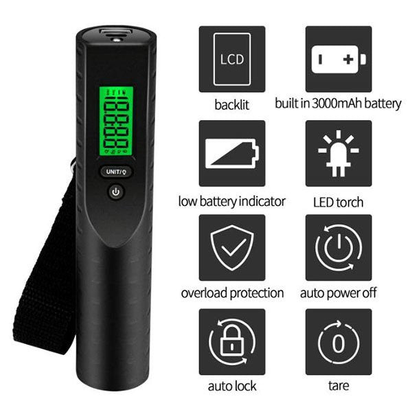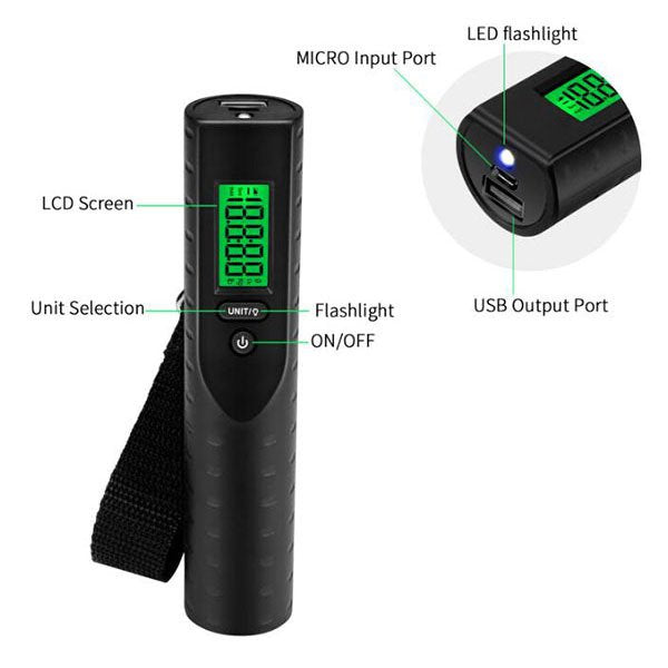 5. 這款行李秤兼具行動電源功能,讓您隨時為手機充電,USB接口設計更加方便快速充電。