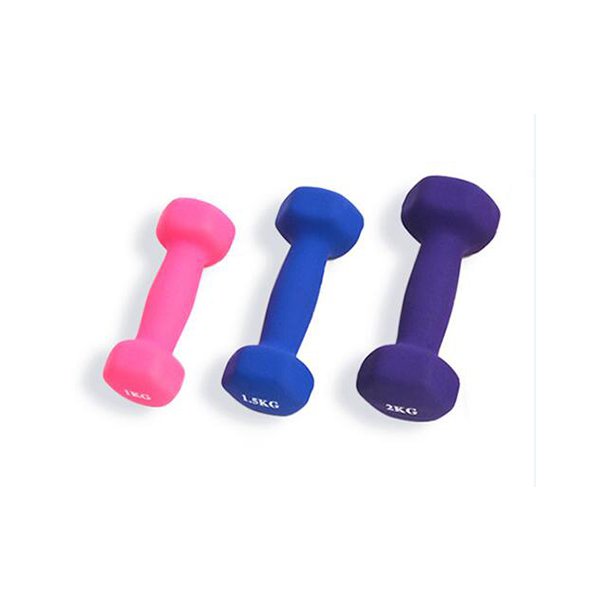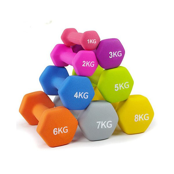 1. 彩色六角形氯丁橡膠塗層啞鈴,適合健身房、家庭使用。