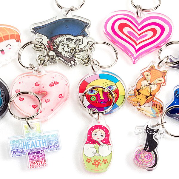 1. 壓克力鑰匙圈採用5mm厚透明壓克力製成,可客製切型,印刷彩色圖案,獨特時尚設計。