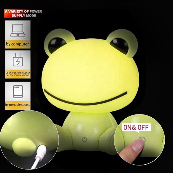1. 青蛙造型USB供電LED夜燈,尺寸為19.5*16.5*24.5cm,材質包含ABS、PP和電子元件,提供溫暖的照明。