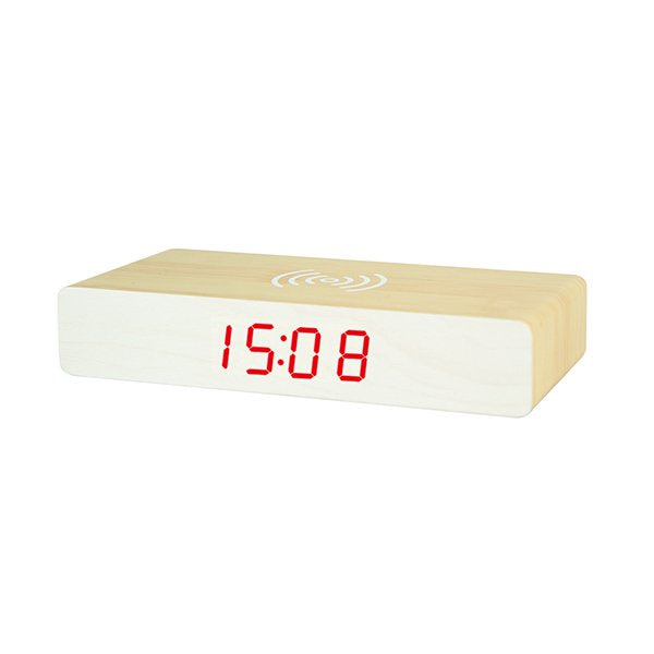1. 木製LED無線充電器桌上電子鐘,尺寸為16*7.5*2.9CM,簡約時尚設計,適合辦公室或家居使用。