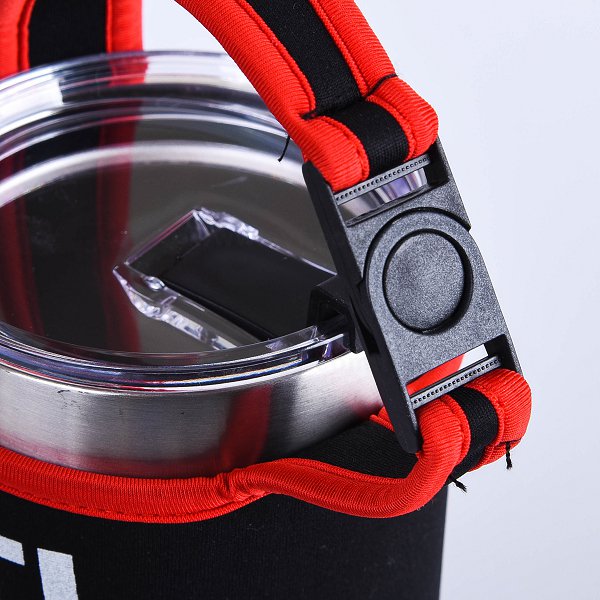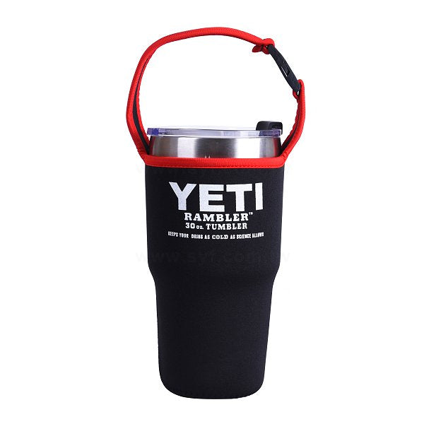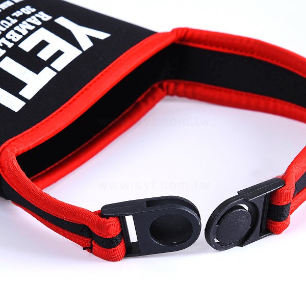 1. 環保潛水布材質製成的手提式杯套,尺寸為14.5cm x 7cm x 17.5cm,配色織帶長22cm,可客製化印刷企業LOGO或宣傳標語。