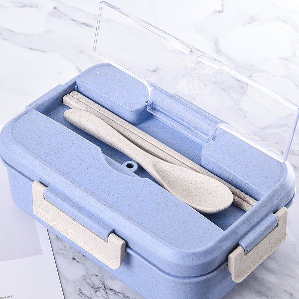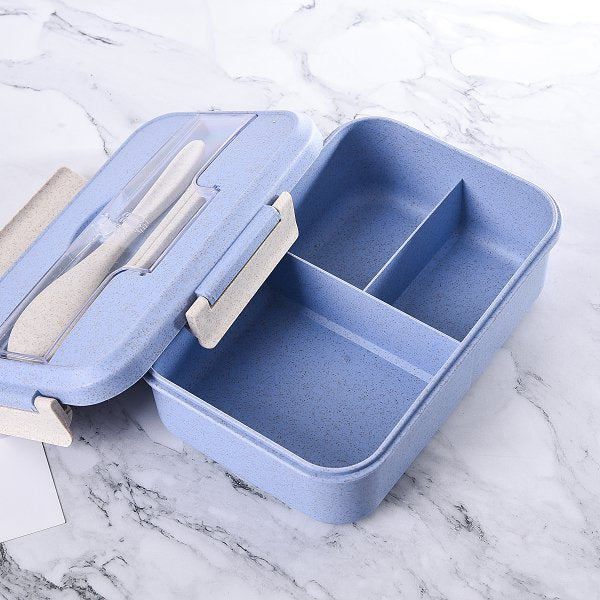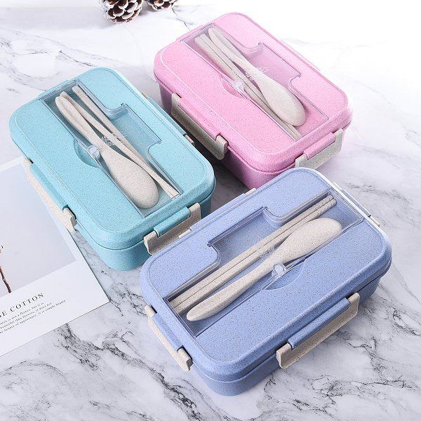 2. 三格設計分隔食物,不混味,方便攜帶。附小麥餐具筷勺,一應俱全,方便使用。