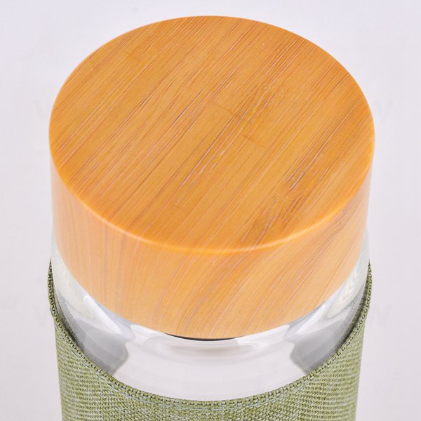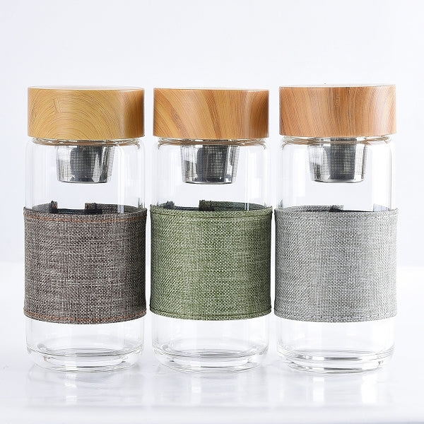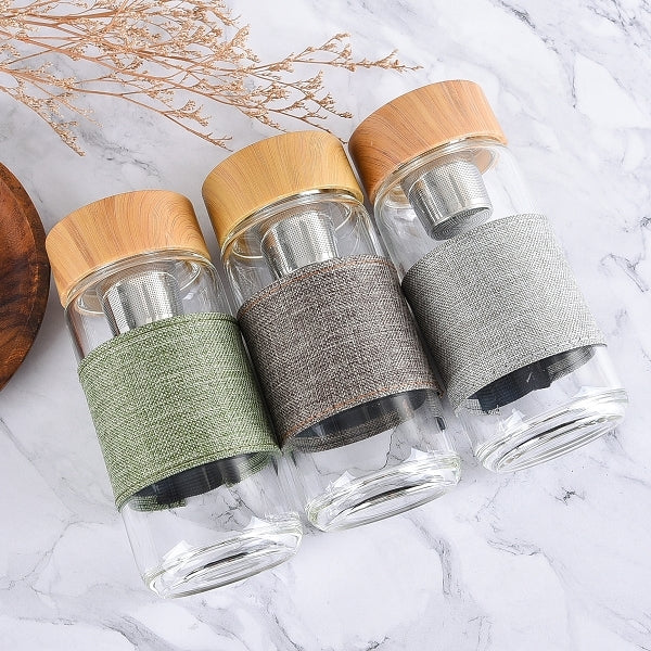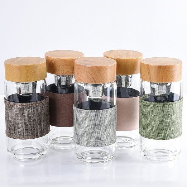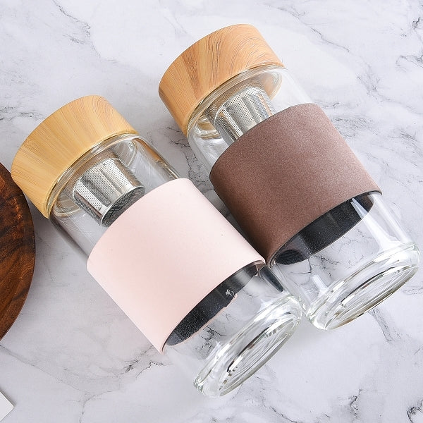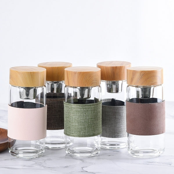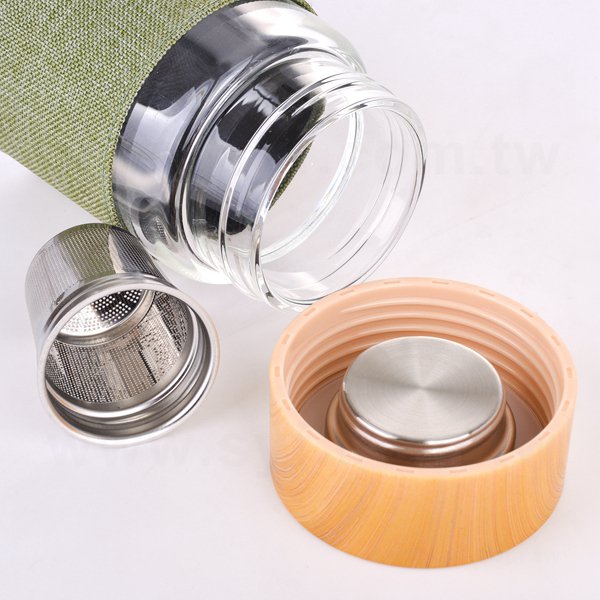 350ml仿竹蓋耐熱玻璃杯 | 茶水分離杯 | 附隔熱布套 (客製化印刷LOGO)