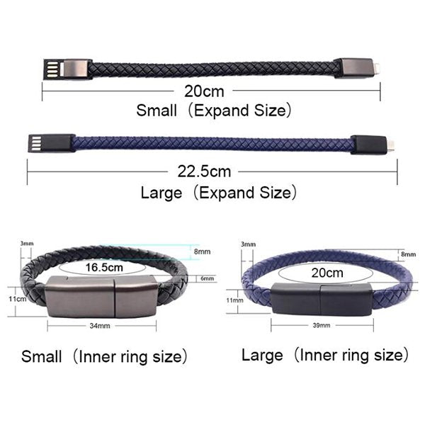 1. 皮革手鍊USB傳輸充電線尺寸分為長20cm(小款)和長22.5cm(大款),材質採用PU皮革和鋅合金24K鍍金製成,外層光滑柔軟,表扣設計時尚巧妙,輕便易佩戴,不易掉落。
