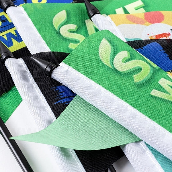 1. 全彩三角手搖旗採用100%聚酯纖維製成,尺寸為15.5 x 10 cm,適合各種場合使用。包裝每20支入一塑膠袋,方便攜帶和存放。