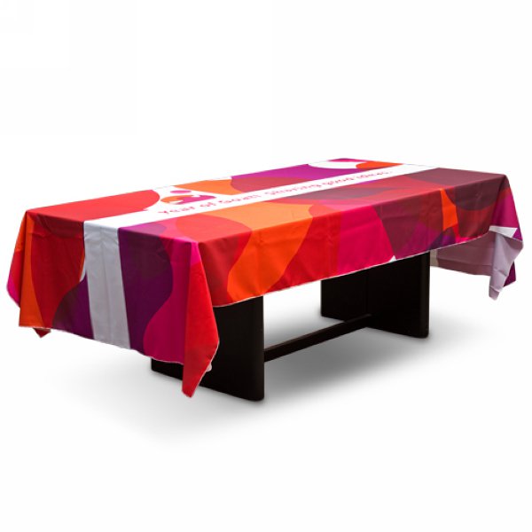 1. 廣告桌巾-90x210cm半罩式斜紋布,單面彩色印刷,專為展覽會、研討會、婚禮等活動場合設計。