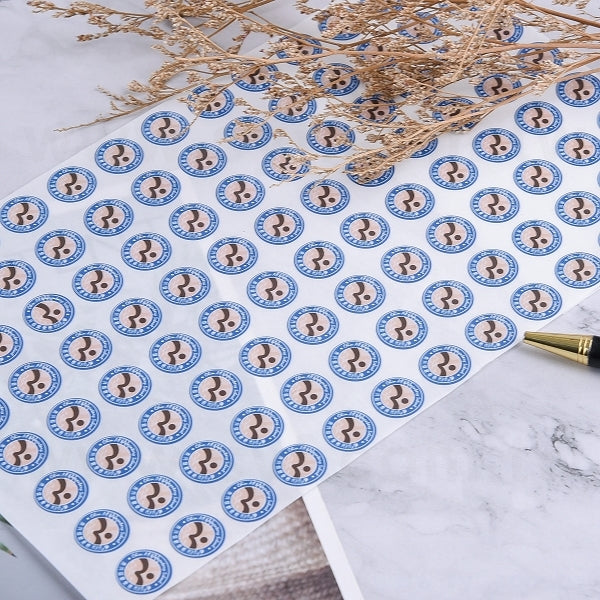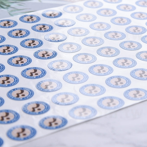1. 圓形超黏銅版貼紙,尺寸15mm,適用於公司產品包裝展現專業形象。