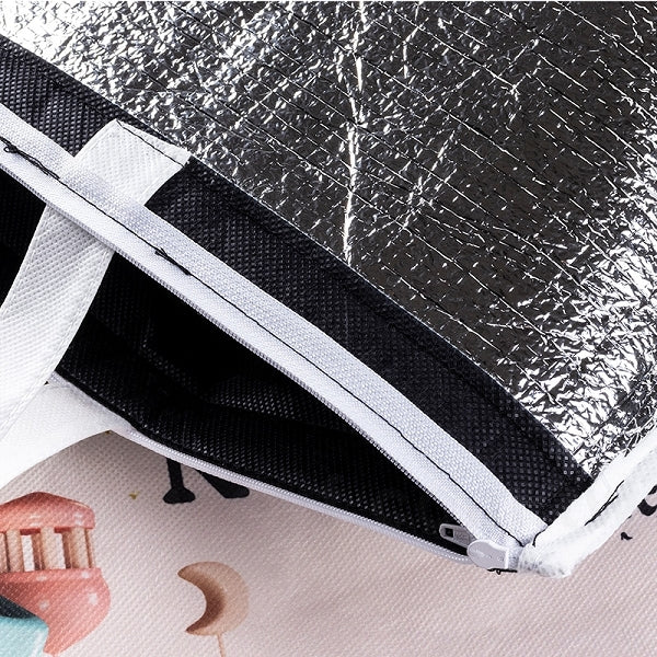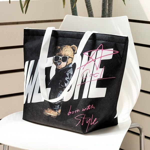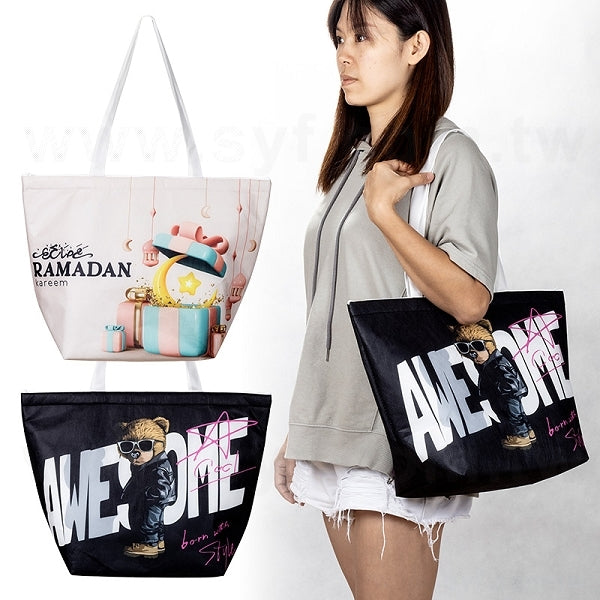 不織布袋單片式3面款式(梯形袋),內裡2mm厚保溫鋁膜,開口拉鍊。全彩滿版印刷在袋身兩面與底部,好設計,廣告效益大。